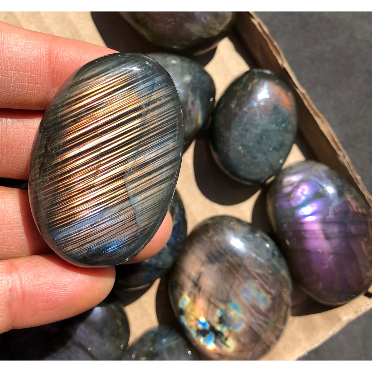 Chaque galet a du beau Reflet violet ou multicolore.
